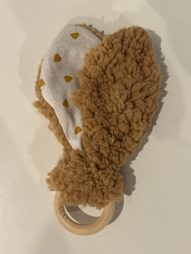Anneau de dentition réalisé avec un anneau dentition en bois naturel et de tissus certifiés Oeko Tex.